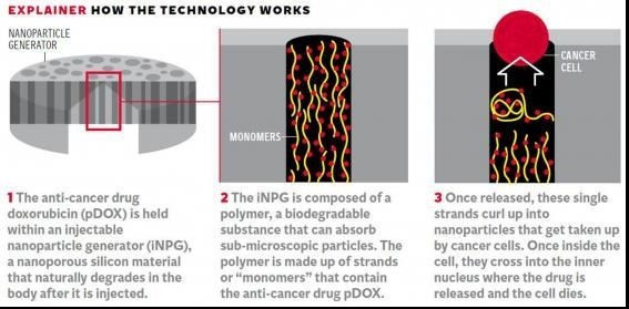 پس از تزریق این دارو به جریان خون، مواد به محل «تومور» میروند که در آنجا «سیلیکون» به روند تجزیه سلولهای سرطانی کمک میکند.
