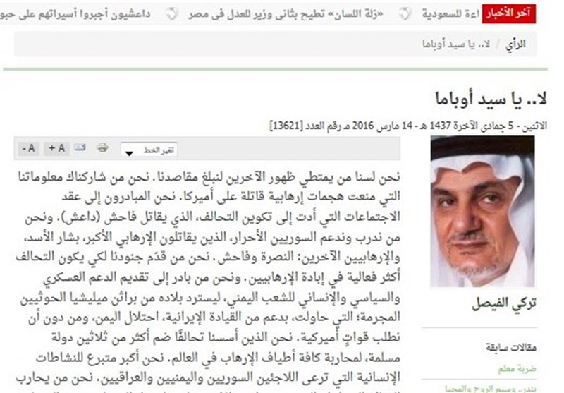 به گزارش گروه بین الملل خبرگزاری تسنیم، پایگاه خبری شبکه تلویزیونی المسیره در مقاله ای تحت عنوان " نامه فیصل.. رسوایی دوران" به قلم "صلاح العزی" نوشت: نامه «ترکی فیصل» رئیس سابق اطلاعات سعودی رسوایی است که واقعیت آل سعود را کاملا عیان کرده و به مثابه توهین به ملت سعودی است تا جایی که می توان آن را رسوایی دوران برشمرد.