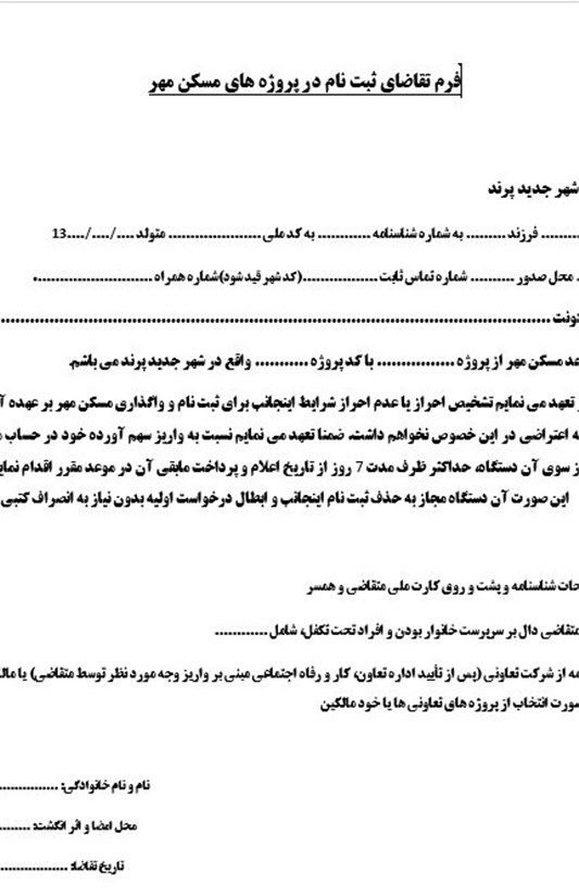 در بخشی از فرم تقاضای ثبت نام در پروژههای مسکن مهر آمده است؛ «...اقرار و تعهد مینمایم تشخیص احراز یا عدماحراز شرایط اینجانب برای ثبت نام و واگذاری مسکن مهر بر عهده آن دستگاه بوده و هیچ گونه اعتراضی در این خصوص نخواهم داشت. ضمناً تعهد مینمایم نسبت به واریز سهم آورده خود در حساب مربوطه بهمیزان اعلامی از سوی آن دستگاه، حداکثر ظرف مدت 7 روز از تاریخ اعلام و پرداخت مابقی آن در موعد مقرر اقدام نمایم؛ در غیر این صورت آن دستگاه مجاز به حذف ثبت نام اینجانب و ابطال درخواست اولیه بدون نیاز به انصراف کتبی میباشد.