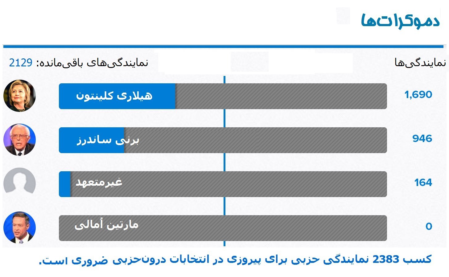 مارتین اُمالی از حزب دموکراتها از گردونه رقابتها کنار کشیده است و اکنون رقابت تنها بین هیلاری کلینتون و برنی ساندرز در جریان است.
