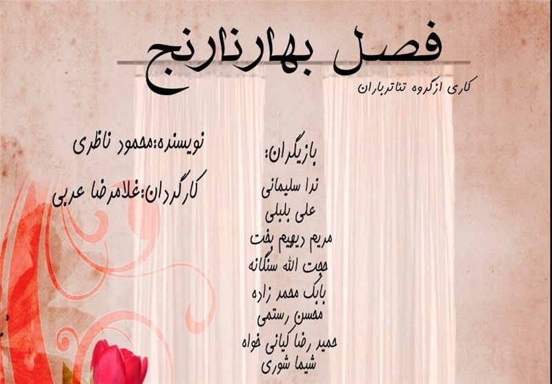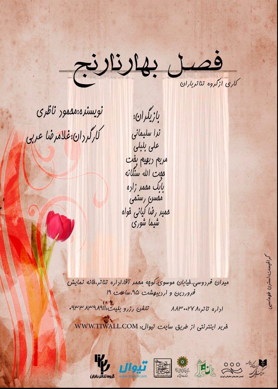 نمایش «بهار نارنج» به کارگردانی غلامرضا عربی از روزدوشنبه 16 فروردین ماه 95ساعت 19 در خانه نمایش اداره تئاتر به روی صحنه میرود.