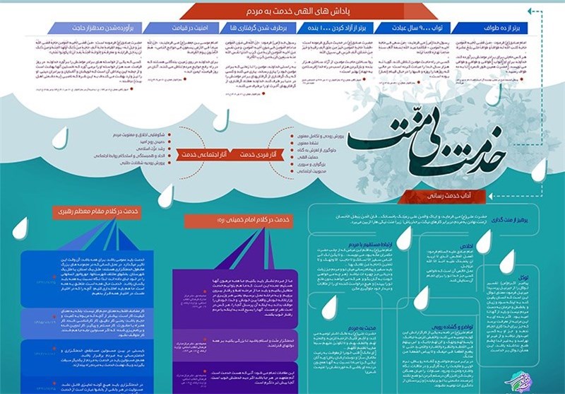 وی افزود: اینفوگرافی «خدمت بی منت» با ارائه موضوعاتی همچون پاداشهای الهی خدمت به مردم، خدمت در کلام امام خمینی(ره) و خدمت از منظر مقام معظم رهبری طراحی و در معرض دید مخاطبین قرار گرفته است.