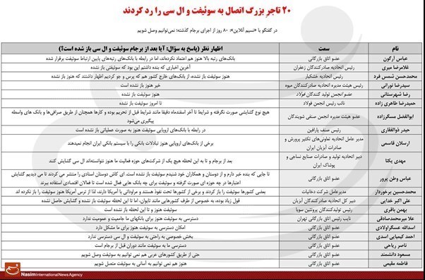 با این حال و با وجود اصرار بیش از حد دولتمردان به دسترسی آسان اکثر بانکهای کشور به سوئیفت و بازگشایی ال سی، «نسیم آنلاین» سراغ 20 فعال اقتصادی رفت تا نظر آنها را در خصوص اتصال به سوئیفت جویا شود.