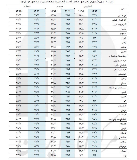 استان کهگیلویه و بویر احمد با نرخ بیکاری 17.7 درصد، کرمانشاه با 17.6 درصد، چهارمحال و بختیاری با 16.4 درصد بیشترین نرخ بیکاری را در سال 94 به خود اختصاص دادهاند. استانهای آذربایجان شرقی با 7.3 درصد، کرمان و مرکزی با 7.9 درصد و تهران با 8.1 درصد کمترین نرخ بیکاری را در این سال داشتهاند.
