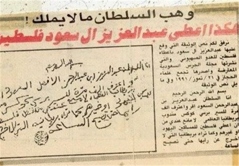 دگرگونی تحولات و فاش شدن روابط نزدیک میان پادشاهی سعودی و رژیم اشغالگر قدس در طول چندین دهه از زمان نامه ملک عبدالعزیز توسعه یافت که طی آن ملک عبدالعزیز سرزمین فلسطین را در طبقی از طلا به صهیونیستها تقدیم کرد که سند آن با متن نامه عبدالعزیز را چند سال پیش محافل مخالف آل سعود منتشر کرده بودند که متن آن چنین است :« بسم الله الرحمن الرحیم، من سلطان عبدالعزیز بن عبدالرحمن آل الفیصل آل سعود برای هزار بار نزد سر پرسی کاکس نماینده بریطانیای کبیر اعتراف و اذعان میکنم که از نظر من هیچ مانعی برای واگذاری فلسطین برای اسکان یهودیان یا دیگرانی که بریتانیا تشخص دهد، وجود ندارد، من تا قیامت هم این نظرم را تغییر نخواهم داد.»