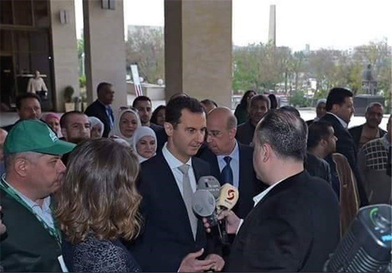 اسد در حین خروج از حوزه انتخاباتی طی اظهاراتی گفت: ملت سوریه از 5 سال پیش وارد جنگی شده است که طی آن تروریسم توانست خون بیگناهان را ریخته و بسیاری از زیرساختها را نابود کند اما در تحقق هدف اصلی که همان نابودی زیرساخت اصلی در سوریه یعنی بنیان اجتماعی و هویت ملی است، ناکام ماند و بر این اساس تروریستها و حاکمان آنها به یک مسیر موازی با یک عنوان سیاسی که هدف اصلی آن ضربه زدن به این زیرساخت اجتماعی و هویت ملی است، روی آوردند.