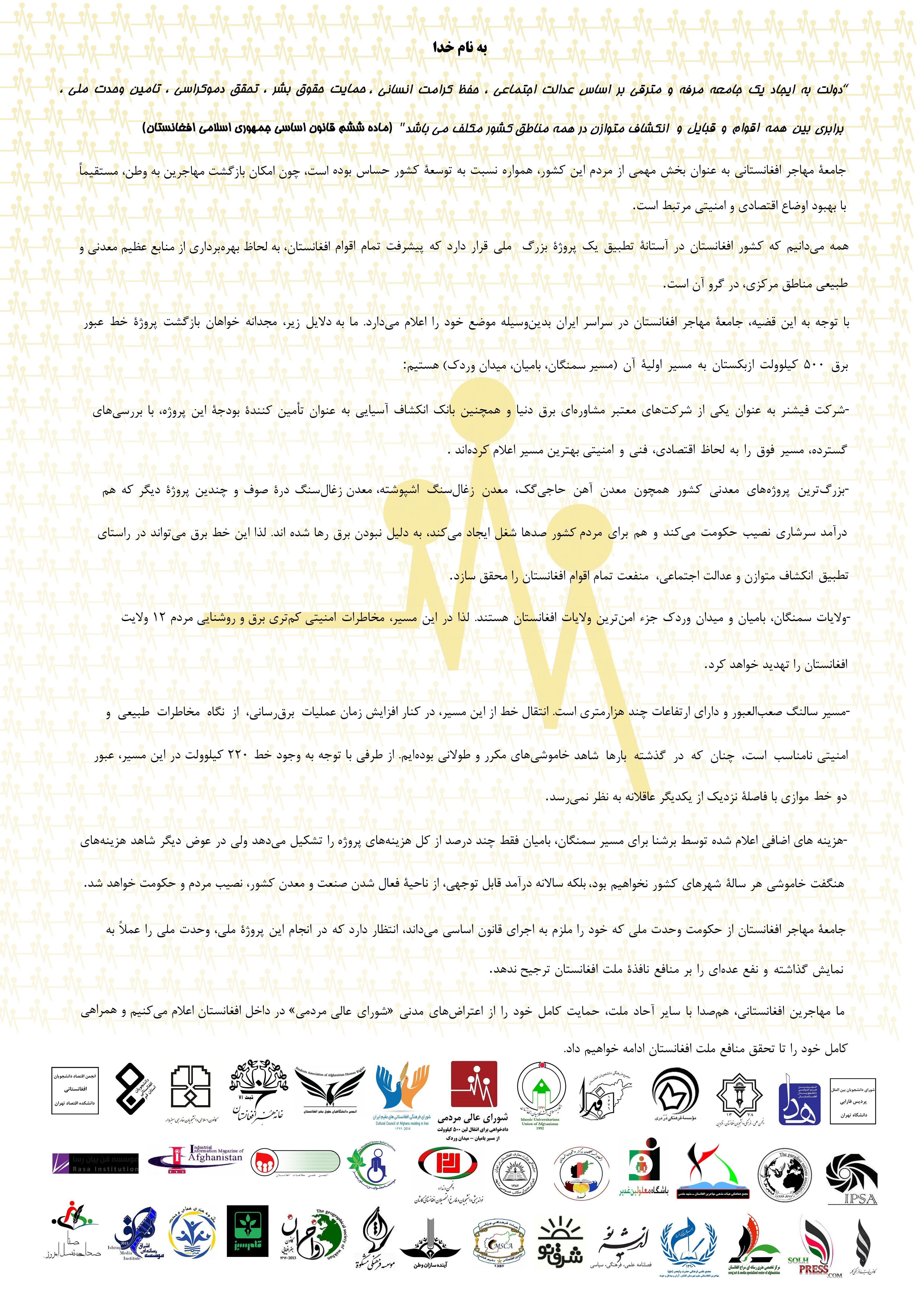 با توجه به این قضیه، جامعه مهاجر افغانستان در سراسر ایران بدینوسیله موضع خود را اعلام میدارد. ما به دلایل زیر مجدانه خواهان بازگشت پروژه خط عبور برق 500 کیلو ولت از ازبکستان به مسیر اولیه آن (مسیر سمنگان، بامیان، میدان وردک) هستیم: