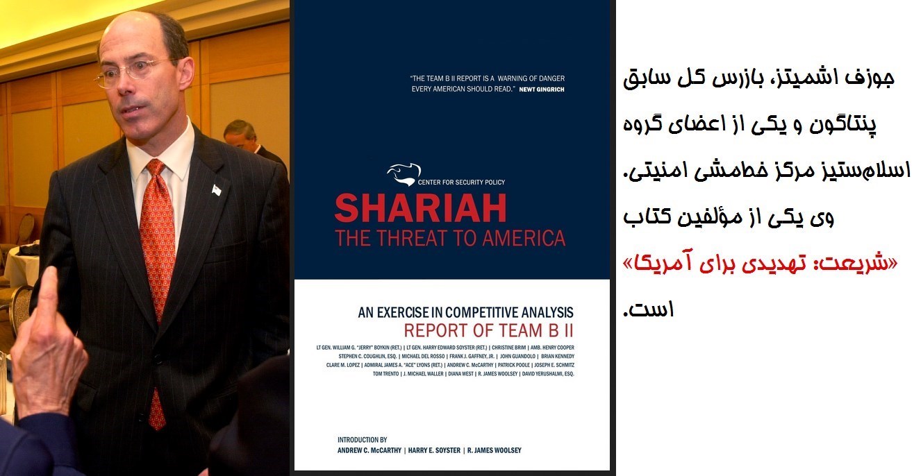 یکی از این افراد ولید فارس (Walid Phares)، کارشناس ارشد سابق در مؤسسه نئومحافظهکار «بنیاد دفاع از دموکراسیها» است که در سال 2012 مشاوره کمپین انتخاباتی میت رامنی را در حوزه خاورمیانه بر عهده داشت. فارس هشدار داده است که مسلمانان آمریکا قصد دارند قوانین شریعت را در این کشور ترویج دهند. فارس در سال 2012 ادعا کرد «برخی مشاورین و کارشناسان در این دولت [اوباما] وجود دارند که با اخوانالمسلمین همکاری دارند» تا سیاست خارجی آمریکا را تحت تأثیر قرار دارند.
