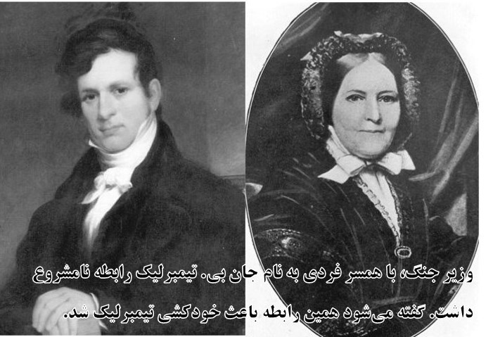 جان هنری ایتون (John Henry Eaton)، وزیر جنگ، با همسر فردی بهنام جان بی. تیمبرلیک (John B. Timberlake) رابطه نامشروع داشت. گفته میشود همین رابطه باعث خودکشی تیمبرلیک شد.