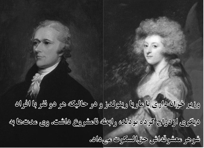 الکساندر همیلتون (Alexander Hamilton)، وزیر خزانهداری، با ماریا رینولدز (Maria Reynolds)، در حالی که هر دو نفر با افراد دیگری ازدواج کرده بودند، رابطه نامشروع داشت. همسر رینولدز برای اینکه این راز را برملا نسازد مدتی طولانی از همیلتون حقالسکوت میگرفت. (1796)