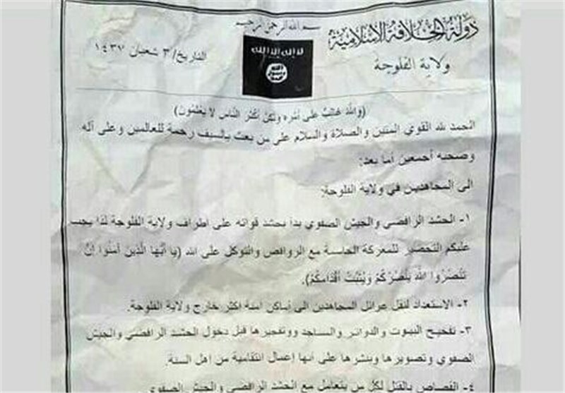 به گزارش گروه بین الملل خبرگزاری تسنیم به نقل از المنار، فعالان شبکه های اجتماعی، تصویری از یک سند متعلق به گروه تروریستی داعش را منتشر کردند که مربوط به پیش از آغاز عملیات آزاد سازی فلوجه است.