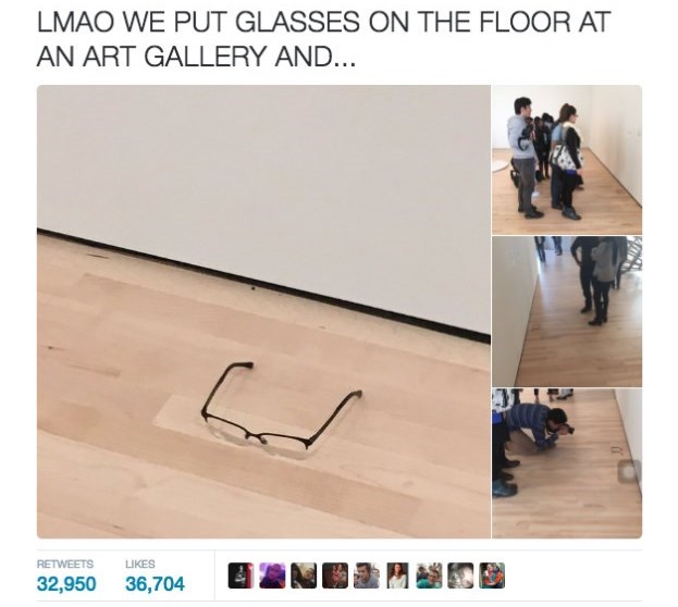 برای این کار «تیجی» و دوستانش یک عینک را در گوشهای از این نمایشگاه روی زمین قرار دادند و طوری وانمود کردند که آن عینک یکی از آثار هنری این نمایشگاه است.