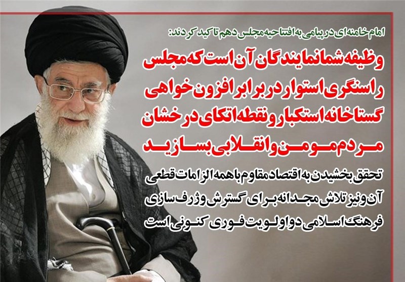 رهبر معظم انقلاب تأکید کردند: وظیفه‌ انقلابی و قانونی شما آن است که مجلس را سنگری استوار در برابر ترفند و افزون‌خواهی گستاخانه‌ استکبار و نقطه‌ اتکای درخشان مردم مؤمن و انقلابی بسازید.