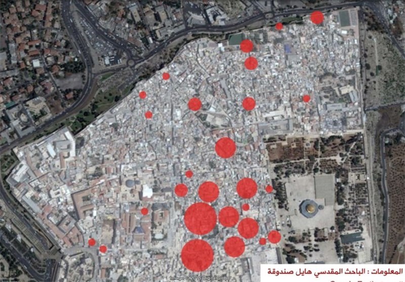 اینفو گرافی و نقشههای پیوست شده توضیح میدهد که طی پنج سال آینده در صورت ادامه روند واگذاری خانهها به شهرکنشینان صهیونیست از طریق فروش مستقیم (با امول اسرائیلیها ) یا فروش باواسطه (با پولهای عربی ) بخشهای گستردهای از منطقه قدیمی قدس به مناطق مسکونی یهودینشین تبدیل خواهد شد. این موضوع در درجه اول به معنی یهودی سازی اطراف مسجدالاقصی بوده و در در درجه دوم اسنادی که از طریق کارشناسان و ناظران ساکن قدس بهدستآمده نشان میدهد که در نیمه سال جاری میلادی ، بیش از 60 ملک کوچک و بزرگ در محلات چسبیده به مسجدالاقصی به دست شهرکنشینان افتاده است.