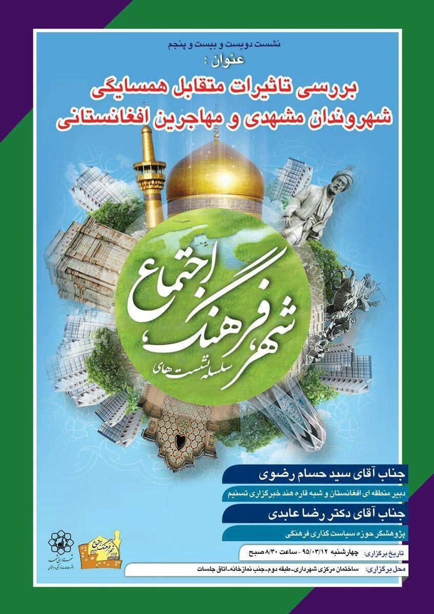 در این نشست تأثیرات متقابل همسایگی شهروندان مشهدی و مهاجرین افغانستانی مورد بررسی قرار میگیرد.
