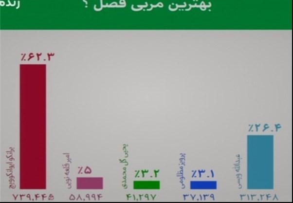 به گزارش خبرنگار ورزشی خبرگزاری تسنیم، سؤال پیامک آخرین برنامه نود در فصل 95ــ94 اختصاص به بهترین مربی فصل داشت که نام 5 گزینه، برانکو ایوانکویچ، امیر قلعهنویی، یحیی گلمحمدی، پرویز مظلومی و عبدالله ویسی در این نظرسنجی قرار داده شد که در نهایت سرمربی تیم پرسپولیس با کسب 62.3 درصد آرای مخاطبان برنامه با اختلاف زیاد نسبت به 4 گزینه دیگر بهترین مربی فصل شد.