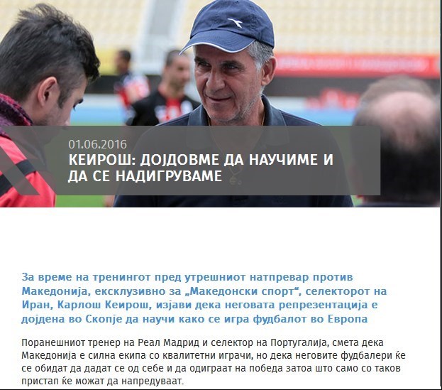 خبرگزاری ورزش مقدونیه در ادامه این مطلب نوشت: مربی سابق تیمهای رئال مادرید، منچستر یونایتد و تیم ملی پرتغال، مقدونیه را تیم قدرتمند میداند و میگوید: بازیکنان مقدونیه کیفیت فنی بالایی دارند و تلاش زیادی در طول بازی میکنند تا به پیروزی برسند، فقط همین مسئله میتواند باعث پیشرفت و موفقیت تیمی شود.