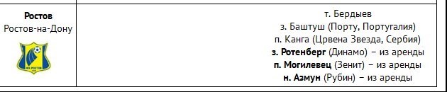 طبق فهرست سایت ورزش روسیه از تیم روستوف باستوس به تیم پورتوی پرتغال خواهد پیوست.کانگ از تیم ستاره سرخ بلگراد پیشنهاد دارد و روتنبرگ نیز با توجه به اتمام دوره قرضی بازی در تیم روستوف دوباره به دینامو مسکو باز میگردد.
