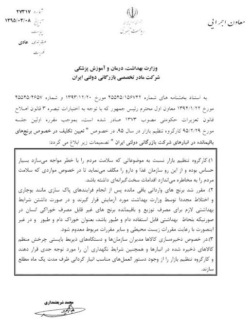 1 ــ کارگروه تنظیم بازار نسبت به موضوعاتی که سلامت مردم را با خطر مواجه میسازد بسیار حساس بوده و از این رو سازمان غذا و دارو را مکلف مینماید تا در خصوص مواردی که سلامت مردم را به مخاطره میاندازد اقدامات سختگیرانهای داشته باشد.