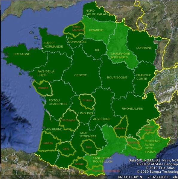 هماکنون در کشور فرانسه 21 منطقهای که مواد دستکاری ژنتیکی شده یا تراریخته را کشت میکنند، شناسایی شدهاند؛ برخی از این مناطق عبارتند از ایلد فرانس، لورن، جزیره کورس، شامپانی آردن و ... که در تصویر زیر بهطور کامل قابل مشاهده هستند.