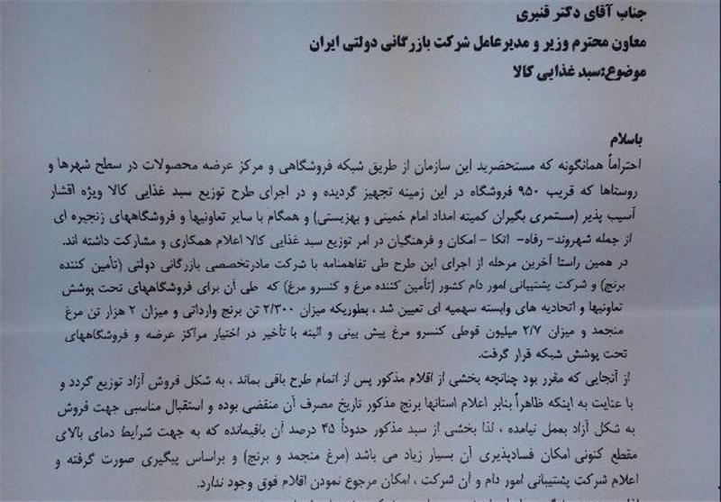 در نامه صفایی به قنبری آمده است: "احتراما همانگونه که مستحضرید این سازمان از طریق شبکه فروشگاهی و مرکز عرضه محصولات در سطح شهرها و روستاها که قریب 950 فروشگاه در این زمینه تجهیز گردیده و در اجرای طرح توزیع سبد غذایی کالا ویژه اقشار آسیبپذیر (مستمری بگیران کمیته امداد امام خمینی و بهزیستی) و همگام با سایر تعاونیها و فروشگاههای زنجیرهای از جمله شهروند، رفاه، اتکا، امکان و فرهنگیان در امر توزیع سبد غذایی کالا اعلام همکاری و مشارکت داشتهاند. در همین راستا آخرین مرحله از اجرای این طرح ملی تفاهنمامه با شرکت مادرتخصصی بازرگانی دولتی (تامین کننده برنج) و شرکت پشتیبانی امور دام کشور (تامین کننده مرغ و کنسرو مرغ) که طی آن برای فروشگاههای تحت پوشش تعاونیها و اتحادیههای وابسته سهمیهای تعیین شد، به طوری که میزان 2300 تن برنج وارداتی و میزان 2 هزار تن مرغ منجمد و میزان 2.7 میلیون قوطی کنسرو مرغ پیشبینی و البته با تاخیر در اختیار مراکز عرضه و فروشگاههای تحت پوشش شبکه قرار گرفت.