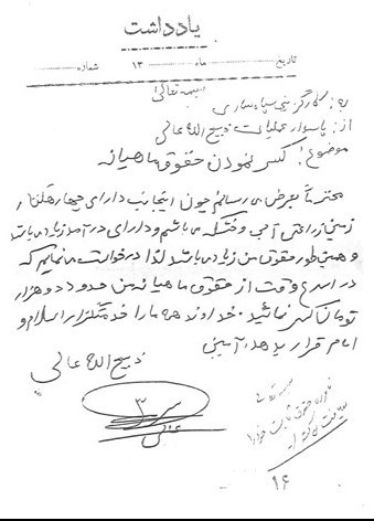 محترماً به عرض می رسانم چون اینجانب دارای چهار هکتار زمین زراعتی آبی و خشکه می باشم و دارای درآمد زیاد می باشد و همین طور حقوق من زیاد می باشد. لذا درخواست می نمایم که در اسرع وقت از حقوق ماهیانه من حدود دو هزار تومان کسر نمائید. خداوند همه ما را خدمتگزار اسلام و امام قرار بدهد.