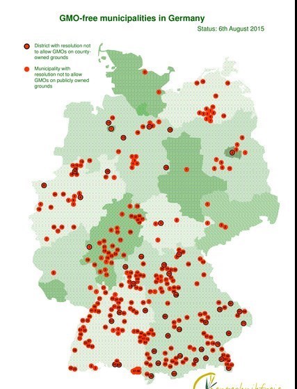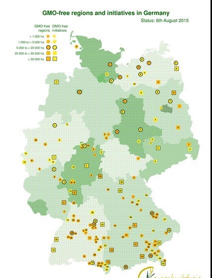 بر اساس گزارشی در اوایل آگوست سال 2015، 215 منطقه و 345 بخش کشت محصولات تراریخته و 31 هزار و 960 کشاورزی که این محصولات را کشت میکردند،در کشور آلمان شناسایی شدند که در تصویر زیر مشخص هستند.