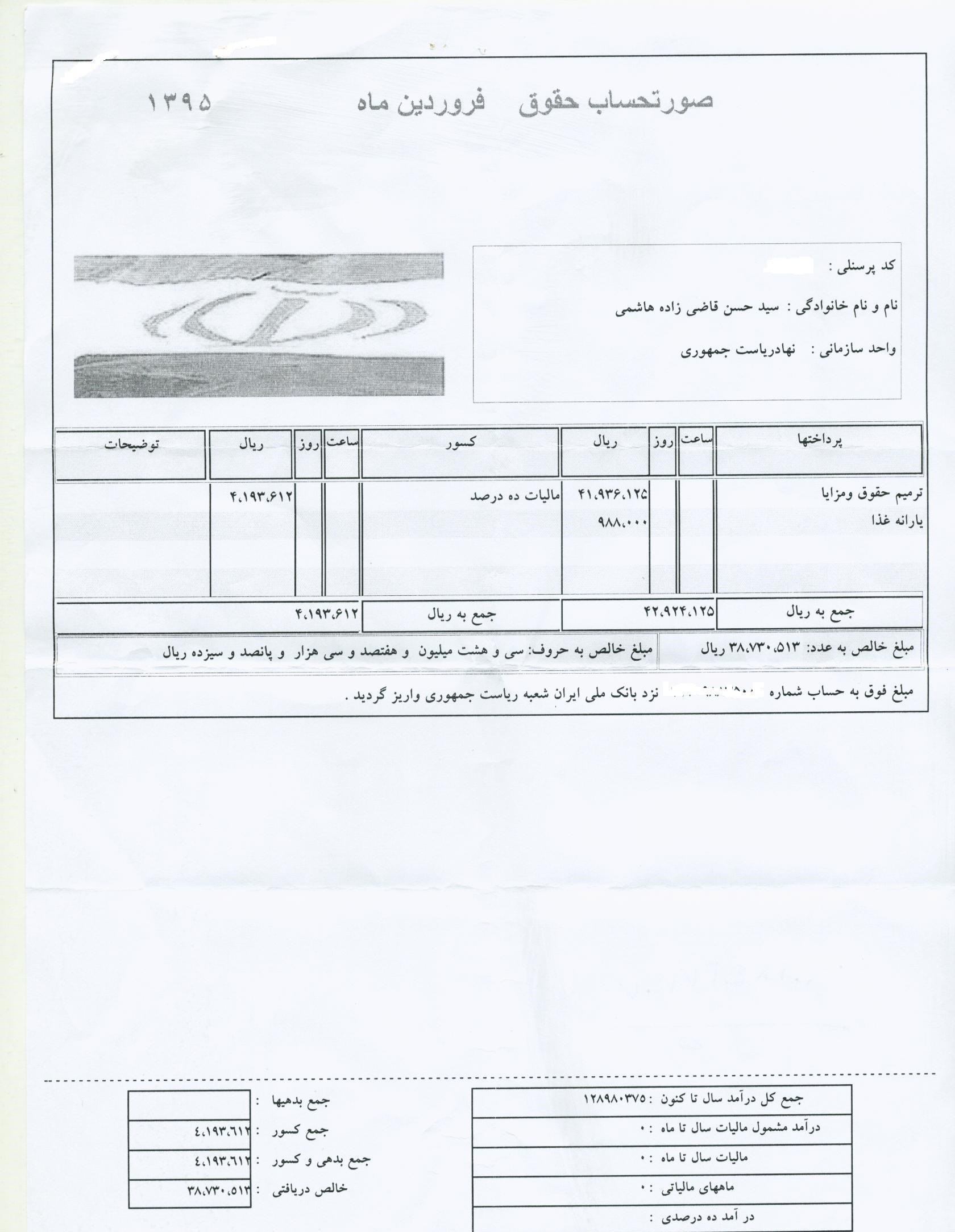 جعفریان در ادامه افزود: در جایی دیدم یک فیش حقوقی وجود دارد که با مبلغ 228 میلیون تومان منتسب به وزیر بهداشت عنوان شده است. وزیر بهداشت چون عضو هیات علمی دانشگاه علوم پزشکی تهران است و ابلاغ وی را بنده امضا میکنم تاکید میکنم که وی حقوق 8 میلیون تومانی قبل از کسر مالیات از دانشگاه دریافت میکند و هیچگونه پرداخت دیگری به وی در دانشگاه و وزارت بهداشت صورت نمیپذیرد و از نهاد ریاست جمهوری نیز مبلغی به عنوان فوق العاده مدیریت در حد 4 میلیون تومان دریافت میکند.