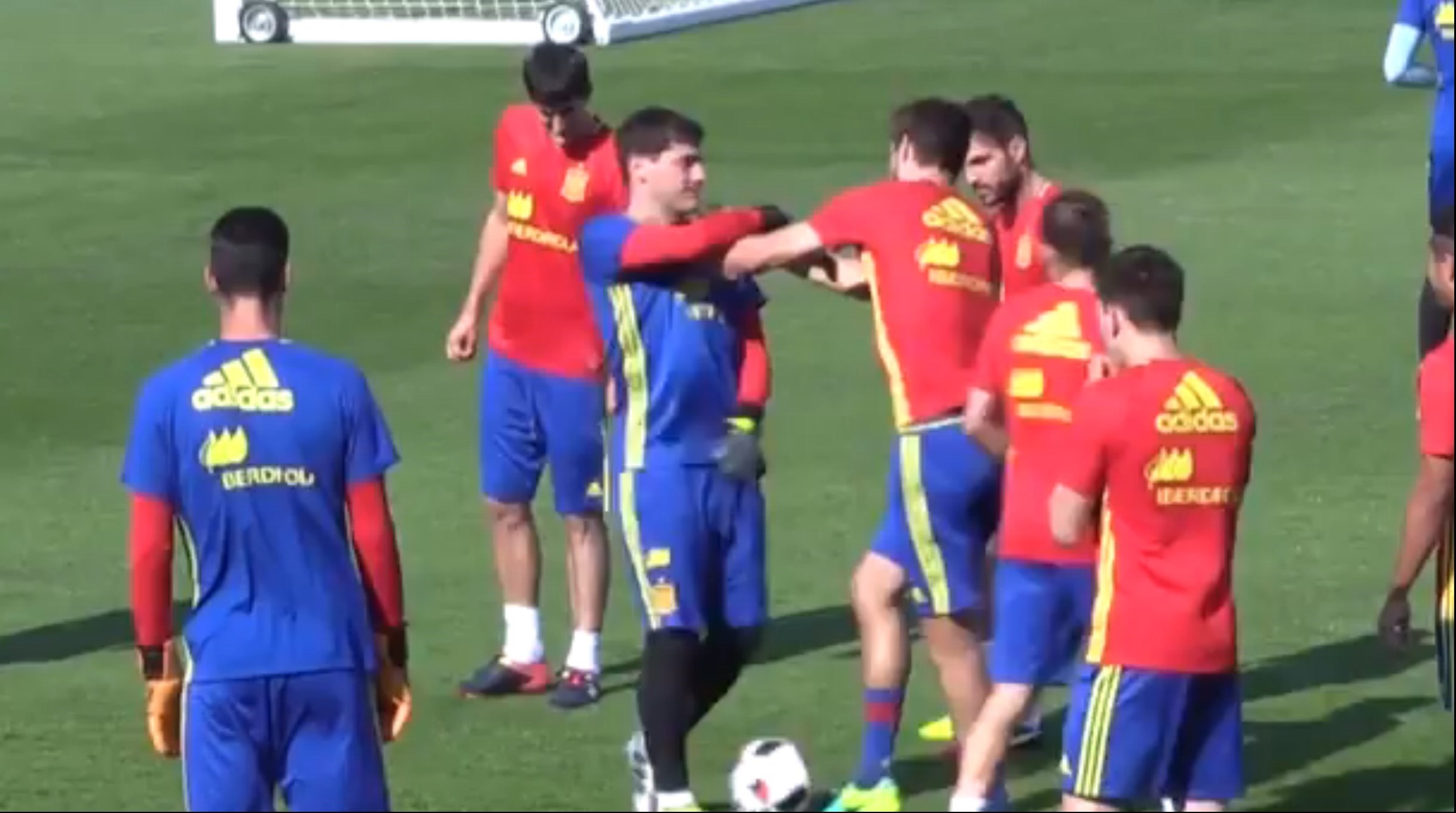 دروازه‌بان نیمکت‌نشین تیم ملی اسپانیا در جریان یکی از تمرینات به هم‌تیمی بارسایی‌اش پس از تلاش او برای لایی زدن به کاپیتان پیشین رئال‌مادرید، سیلی زد.