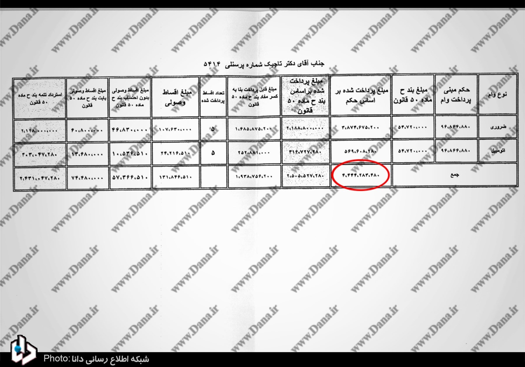 طبق سند فوق تاجیک، عضو سابق هیئت مدیره بیمه ایران که به تازگی به عضویت هیات مدیره بانک ملت درآمده نیز به غیر از 180 میلیون وام تعمیرات و مسکن، 440 میلیون نیز وام ضروری و اتومبیل دریافت کرده است.
