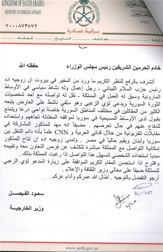 در یک سند افشا شده دیگر که خطاب به ملک عبدالله پادشاه وقت سعودی است،سعود الفیصل نظر شاه را به این نکته جلب میکند که «روجیه أده» رئیس حزب السلام لبنان(که بازرگانی مسیحی مارونی با سابقه فعالیت در عربستان بود) نزد سفیر سعودی در بیروت وساطت کرده است تا امکان سفر به عربستان برای «لؤی الزعبی» یکی از رهبران سلفی تحرکات مسلحانه در سوریه و همکاری سازنده میان وی و پادشاهی سعودی فراهم شود. أده بر اساس این سند به این اشاره کرده است که الزعبی میانهرو بوده و مورد تایید بسیاری از جنگجویان به ویژه در درعا است. فیصل در پایان نامه خود، پیشنهاد میکند از الزعبی برای سفر به عربستان به عنوان میهمان وزیر فرهنگ و اطلاع رسانی سعودی دعوت شود.(تصویر زیر)