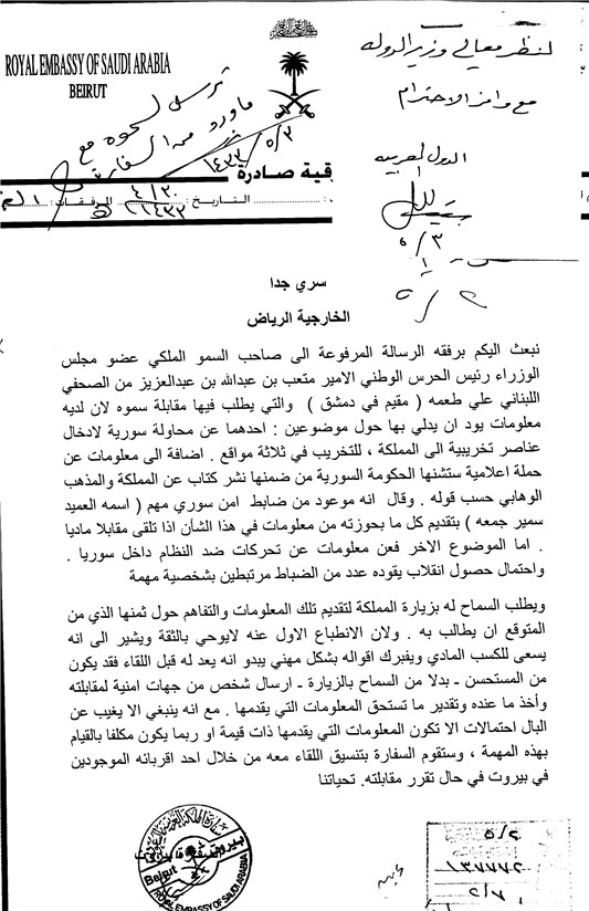 سند افشا شده دیگری صادره از سفارت عربستان سعودی در بیروت مورخه 25 مارس 2012 میلادی است. این سفارت، نامه یک فعال رسانهای لبنانی به نام علی طعمه به متعب بن عبدالله رئیس گارد سلطنتی سعودی را اعلام کرده است. در این نامه ادعا شده است که سوریه برای وارد کردن گروههای خرابکار به عربستان و آماده کردن طرحی علیه پادشاهی تلاش میکند.