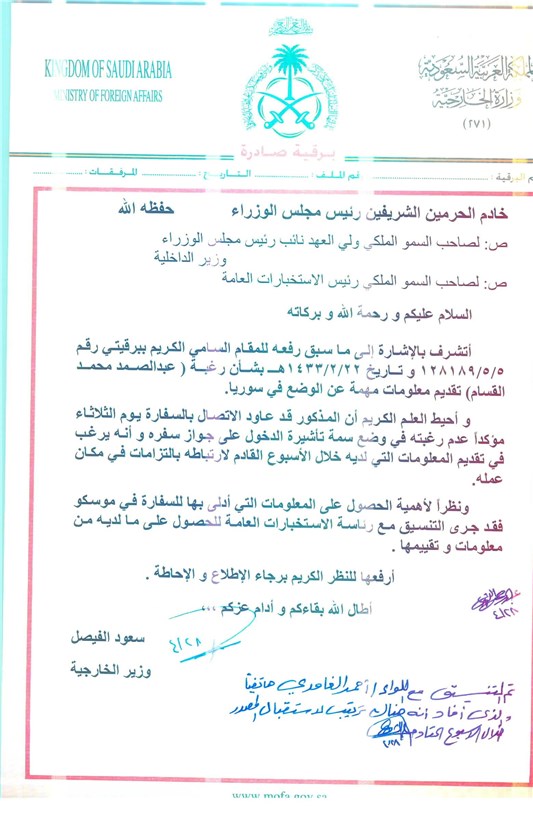 در سند دیگری به تاریخ 22 می 2012 میلادی، سعودالفیصل در نامهای به خالد التویجری رئیس وقت دربار پادشاهی آل سعود اطلاع میدهد که معاون وی(یعنی فیصل) سلم المسلط فرزند شیخ قبیله الحبور و عضو شورای قبایل سوریه را به حضور پذیرفته است. در این دیدار اعلام شد که شورای ملی(یکی از تشکلات مخالفان خارج نشین سوریه)عملکرد ضعیف داشته و الجیش الحر(شبه نظامیان مخالف دولت سوریه) در جایگاهی که(مطلوب عربستان) باشد، قرار ندارد . المسلط درباره تلاش ترکیه برای حمایت از الجیش الحر در راستای طرحهای خود هشدار داده است. در پایان این نامه، فیصل پیشنهاد میدهد از قبایل در برابر پیوستن آنها به شورای ملی حمایت شود،با توجه به اینکه سیاست پادشاهی سعودی بر این قرار گرفته ه نظام سوریه تغییر خواهد کرد.(تصویر زیر)