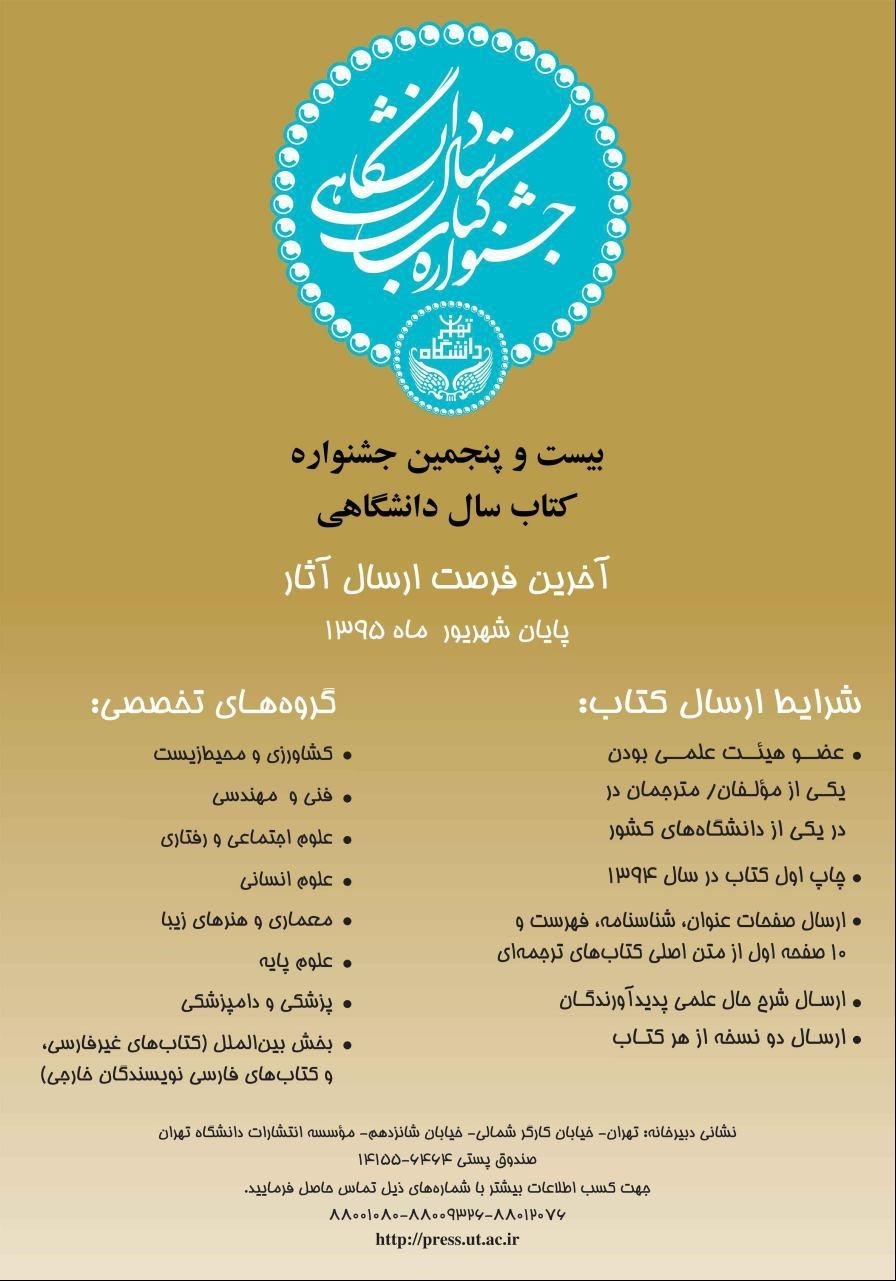 لازم به ذکر است که این جشنواره در مؤسسه انتشارات دانشگاه تهران واقع در خیابان کارگر شمالی تهران برگزار میشود؛ برای کسب اطلاعات بیشتر به آدرس www.press.ut.ac.ir مراجعه کنید.