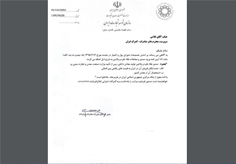 در این نامه آمده است: صدور طلا، نقره و پلاتین تولید داخلی پس از تأیید وزارت صنعت مبنی بر عدم فروش آن دربازار داخلی بهقیمتهای رقابتی بین المللی و استحصال از معادن کشور با اخذ مجوز از بانک مرکزی در هر مرحله بلامانع است.