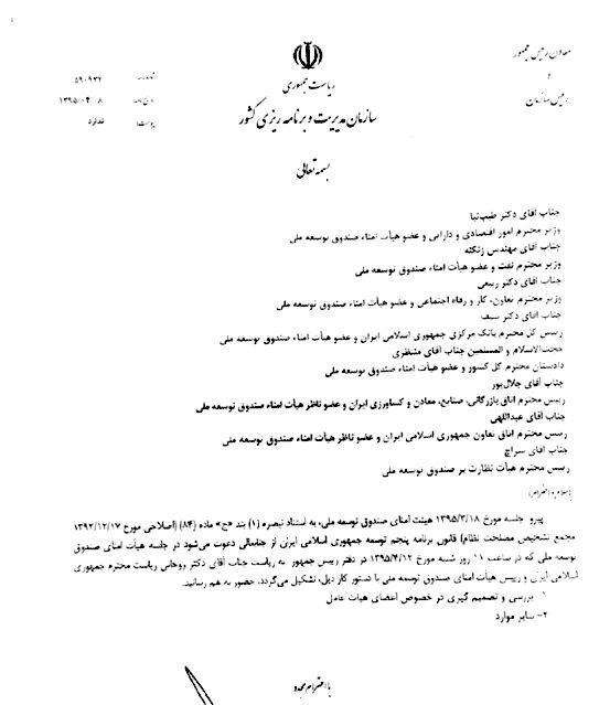 یکی از دستورات جلسه فردای هیئتامنای صندوق توسعه ملی بررسی و تصمیمگیری درباره اعضای هیئت عامل این صندوق است.