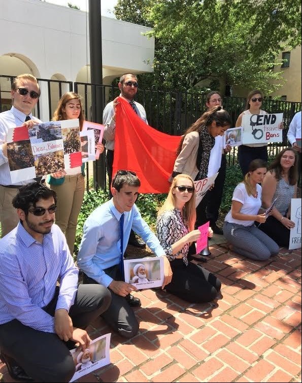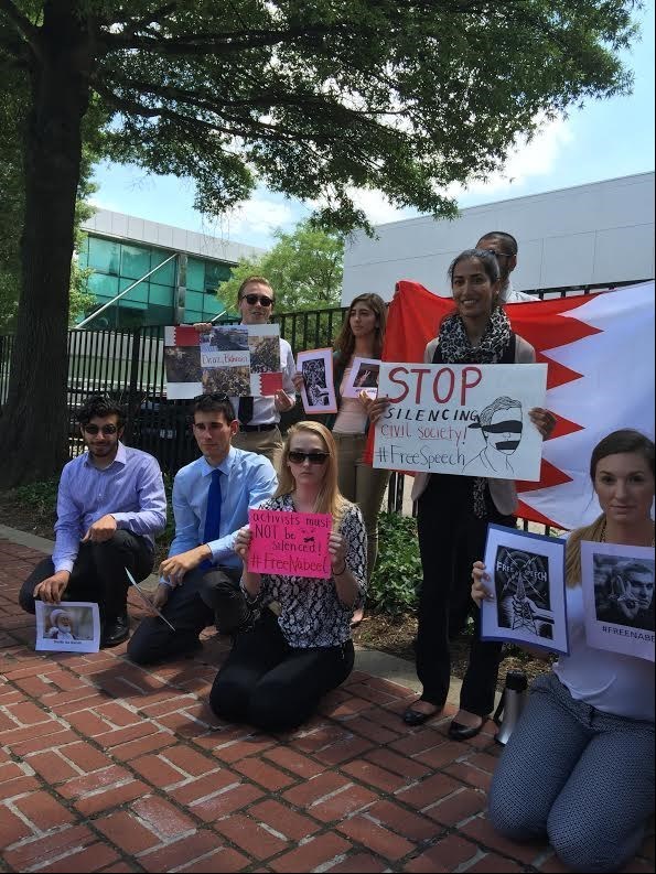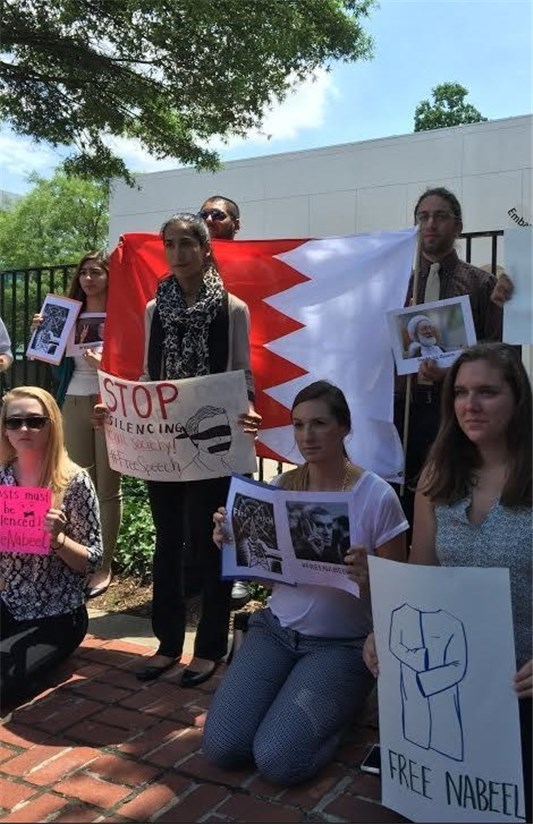 این تجمع از سوی "سازمان آمریکاییها برای دموکراسی و حقوق بشر در بحرین" برگزار شده بود. شرکت کنندگان دستنوشته و همچنین عکسهایی از عیسی قاسم و زندانیان سیاسی بحرین در دست داشتند که روی آنها نوشته بود: سکوت را بشکنید... منع مسافرت را پایان دهید... شیخ قاسم را آزاد کنید... نبیل را آزاد کنید... فعالین سیاسی نباید سکوت کنند.