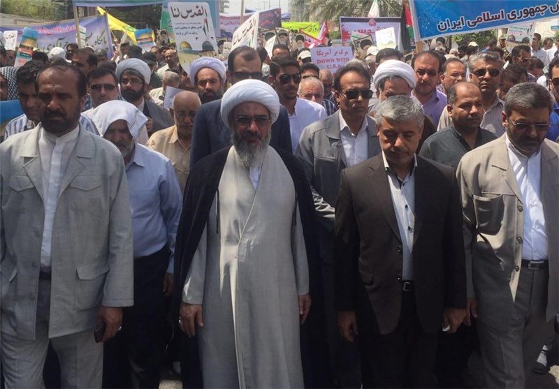 در مراسم راهپیمایی روز جهانی قدس که امام جمعه، استاندار بوشهر و تمامی قشرها و گروهای مختلف مردم مومن بوشهر حضور دارند راهپیمایان با شعارهای ولایت فقیه عزت ماست - آبروی دین ودیانت ماست، جنایت اسرائیل، جنایت آمریکاست - این همه قتل و غارت، حمایت آمریکاست، امروز روز قدس و روز دین است - تجلّی قدرت مسلمین است، آل خلیفه آل شیطان بود - دشمن آزادی انسان بود، وهابی کودککش - همدست اسرائیل است مسیر راهپیمایی را طی میکنند.