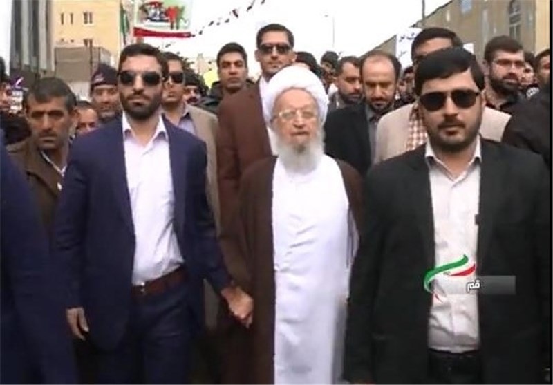 آیت‌الله ناصر مکارم‌شیرازی لحظاتی پیش به جمع راهپیمایی‌کنندگان روز جهانی قدس در شهر مقدس قم پیوست.