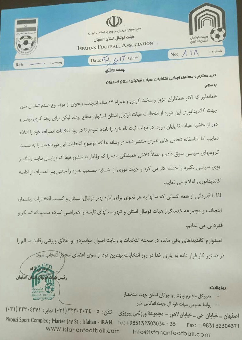 وی که از حدود 14 سال پیش ریاست هیئت فوتبال اصفهان را بر عهده دارد، برای کاندیداتوری ریاست این هیئت در دوره آینده که انتخابات آن چند روز دیگر برگزار میشود، ثبتنام کرده بود.