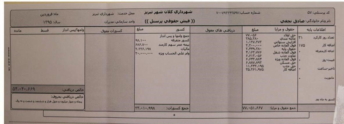 به گزارش خبرگزاری تسنیم از تبریز، در پی انتشار فیشهای حقوقی تنی چند از شهرداران و مسئولان کشور، صادق نجفی شهردار تبریز، فیشهای حقوقی سه ماه اخیر خود را منتشر کرد.