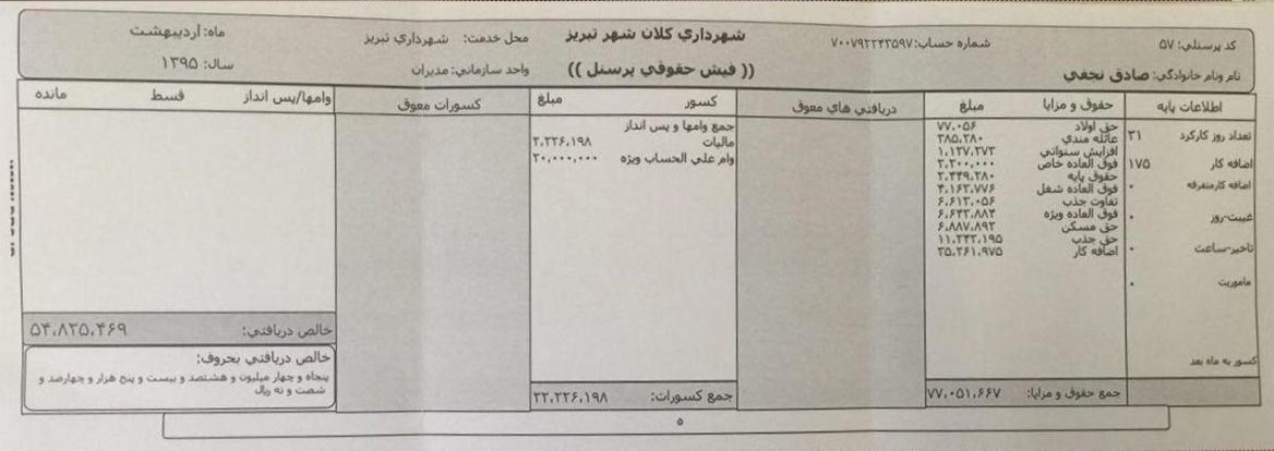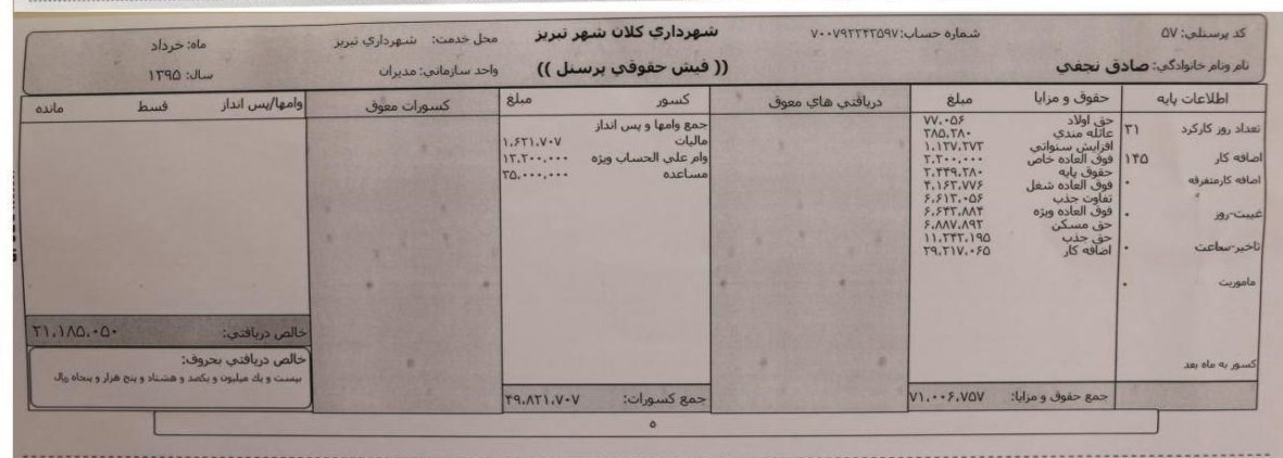 این رقم، تنها، بخشی از دریافتی صادق نجفی از شهرداری تبریز است که در فیش حقوق قابل درج است ولی طبق قانون، شهرداران کشور یک حق عمرانی هم دریافت میکنند که در واقع ترکیبی از آیتمهای متعدد حقوقی است که شامل حقوق مبنا، حق سنوات، فوق العاده شغل و مواردی دیگر میشود که در این فیش حقوقی، این رقم گنجانده نشده است، ضمن اینکه حق ماموریت سفرهای خارجی و داخلی و... نیز در این فیش حقوقی دیده نمی شود.