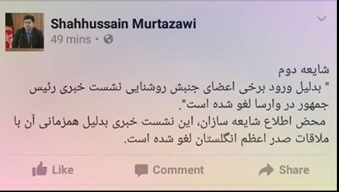 در این اخبار ضد و نقیض آمده بود که دلیل لغو کنفرانس خبری رئیسجمهور افغانستان، حضور تعدادی از اعضای جنبش روشنایی در محل برگزاری کنفرانس خبری غنی بوده است.
