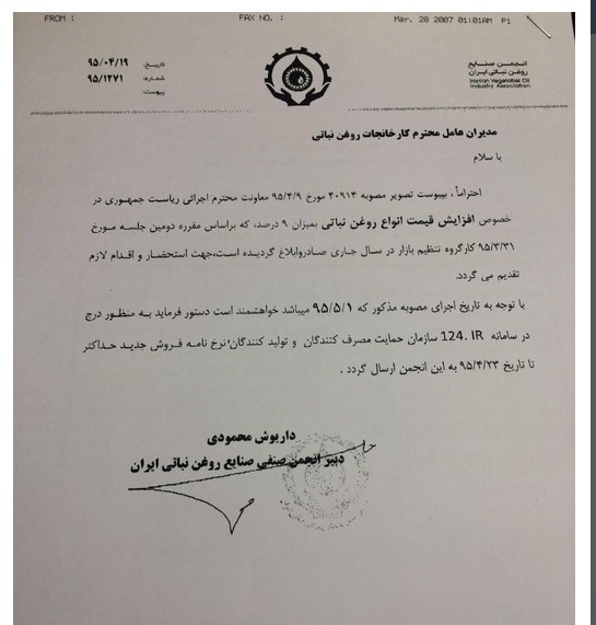 براین اساس پیرو تصمیمات اولین جلسه مورخ 95.02.29 کارگروه تنظیم بازار درسال 95 و در راستای حمایت از کشت دانه‌های روغنی تولید داخل و استفاده از ظرفیت‌های ایجاد شده در صنعت روغن کشی و ترغیب واحدهای روغن نباتی برای خرید دانه های روغنی تولید داخل و همچنین با عنایت به مصوبه مورخ 94.12.03 شورای عالی سلامت و امنیت غذایی کشور در خصوص محدود کردن سهم واردات روغن پالم و با توجه به تصمیمات جلسه مورخ95.03.03 هیئت تعیین و تثبیت قیمت‌ها، با افزایش حداکثر 9 درصدی قیمت انواع روغن نباتی نسبت به آخرین قیمت‌های مصوب موافقت گردید.