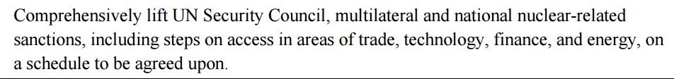 در تفاهم لوزان اینطور درج میشود که اتحادیه اروپا اجرای تحریمهای "ثانویه" آن هم فقط در حوزههای تجاری و مالی را پایان میدهد و آمریکا نیز اجرای عملیات مربوط به تحریمهای هستهای "ثانویه" آن هم فقط در بخشهای مالی و تجاری را "متوقف" (cease the application) میکند، بدین ترتیب اولاً بنای دبه در برداشتن کامل تحریمها (شامل تحریمهای اولیه و ثانویه ملی، بینالمللی و چندجانبه) که در ژنو بر آن توافق کرده بودند پیریزی میشود و ثانیاً در حالی که در ژنو بر رفع تحریمها در همه حوزههای مالی، تجاری، انرژی و تکنولوژی تصریح شده بود، این بار فقط سخن از تحریمهای مالی و تجاری به میان میآید. یکی از مهمترین اتفاقات رخداده در این بین، حذف تعهد طرف مقابل مبنی بر رفع تحریمهای "ملی" است که میتوانست آمریکا را مجاب کند تحریمهای اولیه خود را نیز در این رابطه حذف و راه را بر اعمال واقعی رفع همه تحریمها هموار کند.