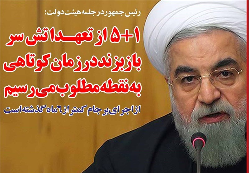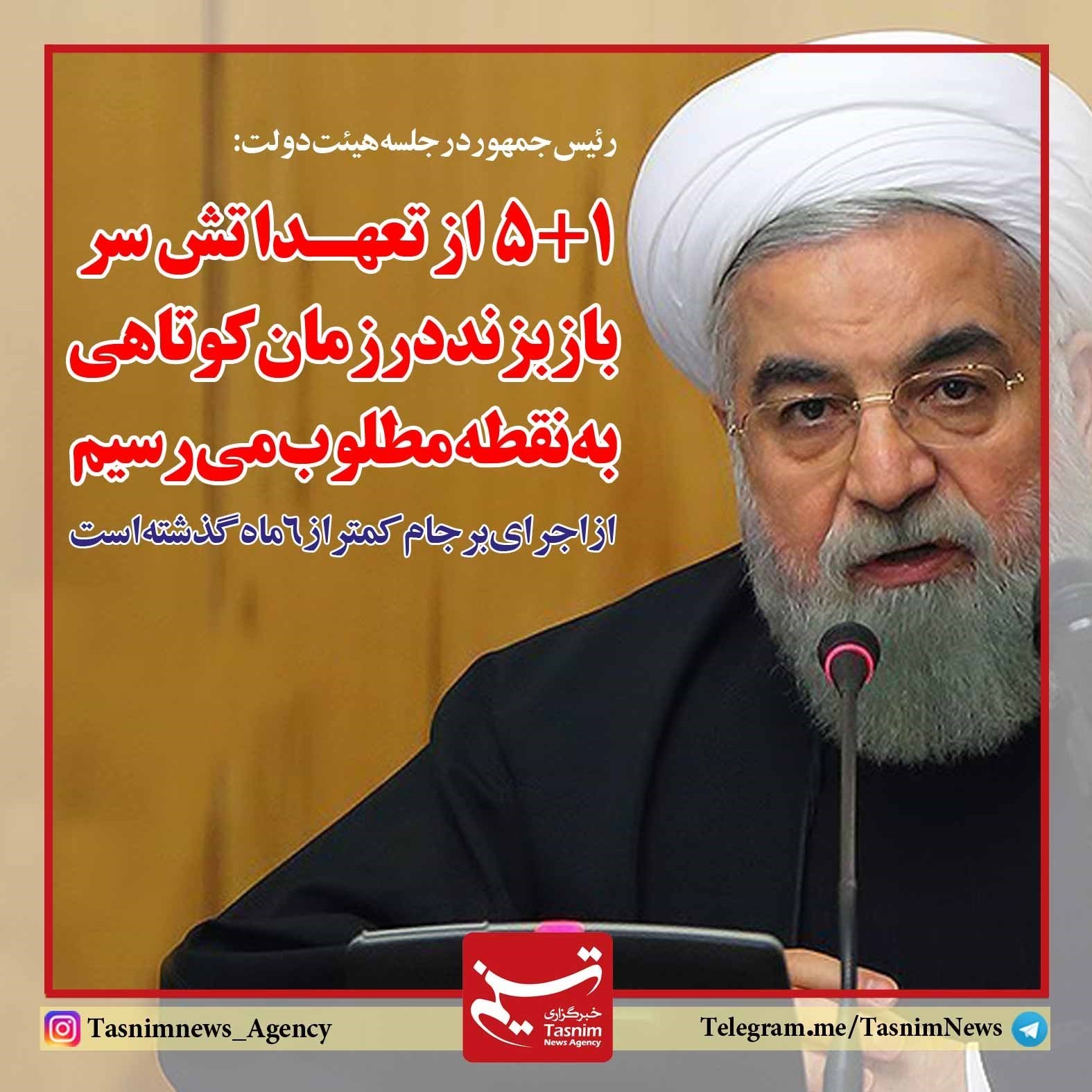روحانی با اشاره به اینکه اگر روزی 1+5 از تعهدات خود سر باز بزند، در زمان کوتاهی به نقطه مطلوب می‌رسیم گفت: از اجرای برجام کمتر از 6 ماه گذشته است.
