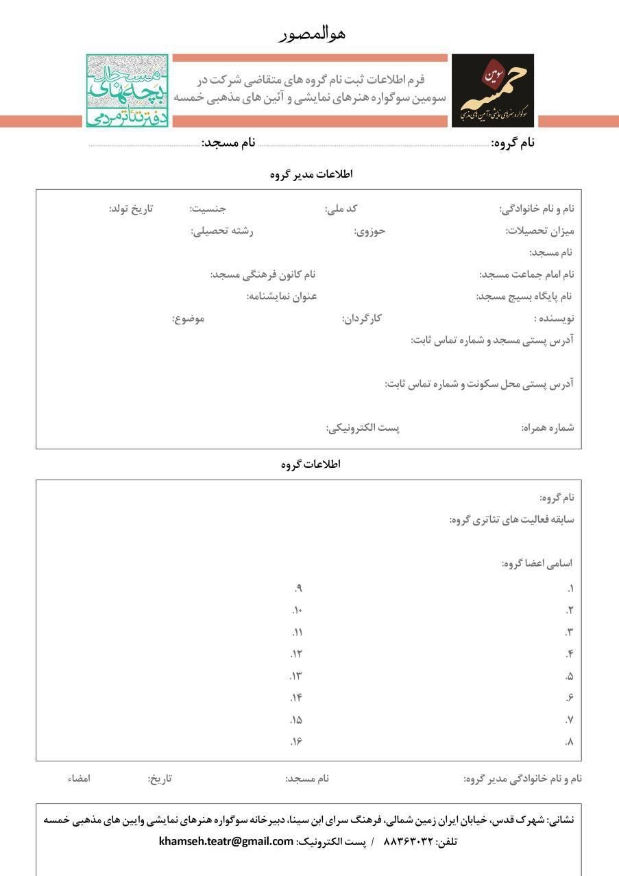 به گزارش خبرنگار فرهنگی باشگاه خبرنگاران تسنیم «پویا»، روز گذشته فراخوان بخش تئاتر مسجد سوگواره «خمسه» منتشر شد. این بخش که با مشارکت دفتر تئاتر مردمی بچههای مسجد حوزه هنری قرار است برگزار شود فرمی برای ثبتنام گروهها در نظر گرفته است که در ادامه منتشر میشود.