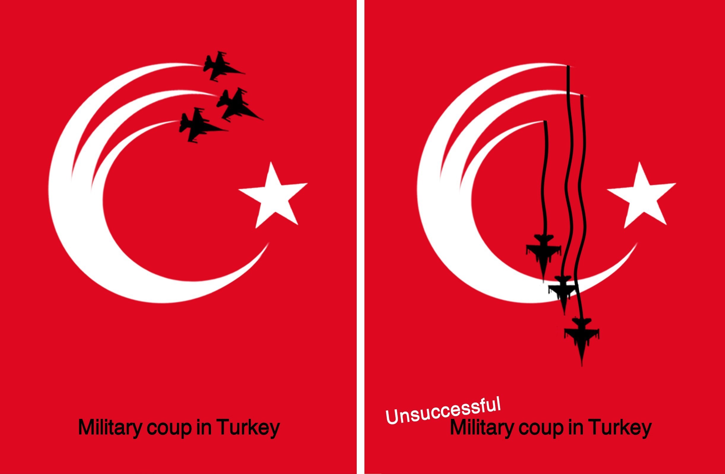 این کودتا و عدم موفقیت آن واکنش سریع کاریکاتوریستهای جهان را نیز در پی داشت. کاریکاتورهایی که همگی به عدم موفقیت کودتاچیان اشاره دارند. در ادامه برخی از این واکنشها را میبینیم.