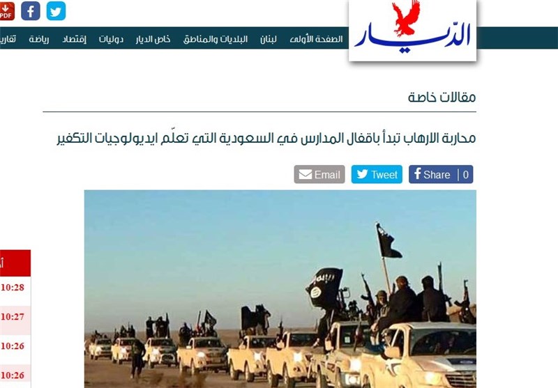 به گزارش تسنیم، روزنامه الدیار لبنان با اشاره به نبرد تمام عیار محور مقاومت با تروریسم تکفیری مورد حمایت آل سعود تاکید کرده است مبارزه جدی با تروریسم، از بستن مدارس در عربستان شروع میشود که ایدلوژی تکفیر را آموزش میدهند(به استثنای مناطق شیعهنشین)