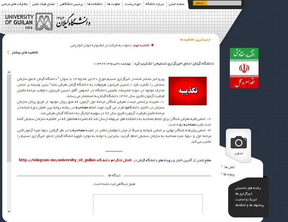 اخیراً دانشگاه گیلان بر روی سایت خود اطلاعیهای درج کرده و تیتر آن را به این جمله اختصاص داده است: "دانشگاه گیلان ادعای خبرگزاری تسنیم را تکذیب کرد"؛ با این وجود مواردی را در اطلاعیه خود مندرج کرده که نه تنها تکذیب خبر خبرگزاری تسنیم نیست، بلکه از قضا به طور کامل خبر تسنیم را تایید میکند!